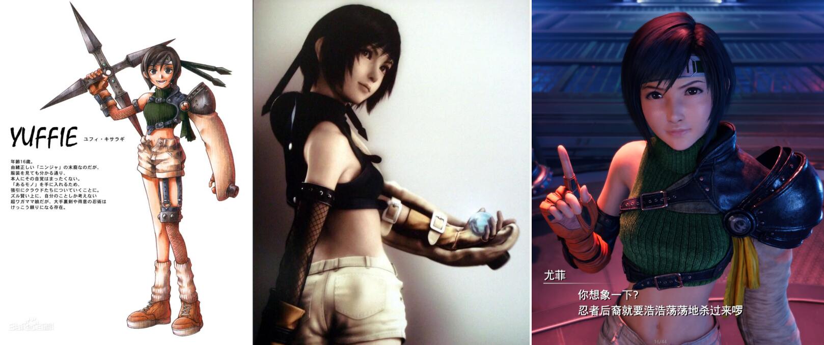 上方的对比图从左到右分别是(1)原版FF7的尤菲、(2)FF7地狱犬挽歌中的尤菲、(3)FF7重制版的尤菲,我们可以在上方的对比图中看出:重制版和原版的尤菲在服装是高度还原的,不同之处在于原版的画风更加偏“DQ”一点,而新版的画风则更加“FF”味。差别比较大是的地狱犬挽歌版尤菲,看起来更像是一个干练的忍者:皮质小坎肩+黑色内衬+皮质腰带军绿色热裤,在后来的电影《最终幻想7圣子降临》中的尤菲也是接近于这个造型。