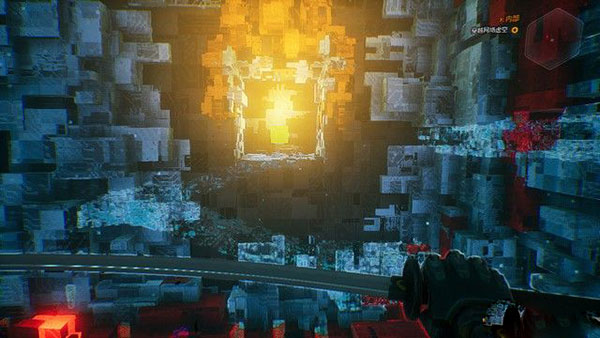 然后就是赛博空间,首先,我们的目标是黄颜色的入口,先沿着透明道路往前走,再跳下去,一直走便可到达。