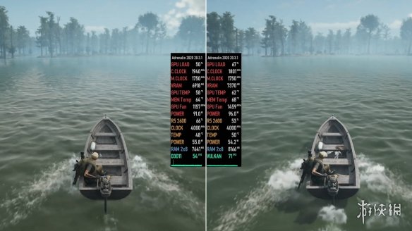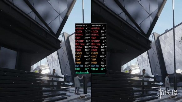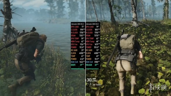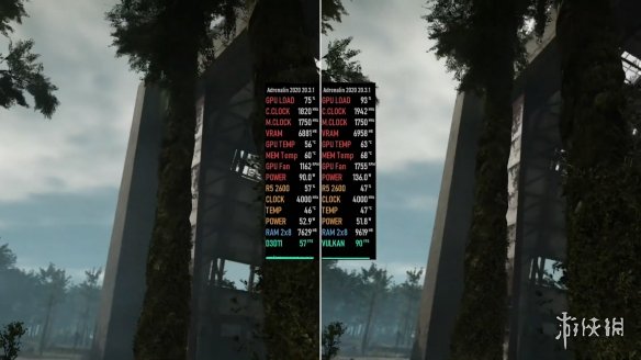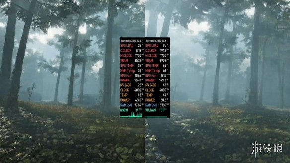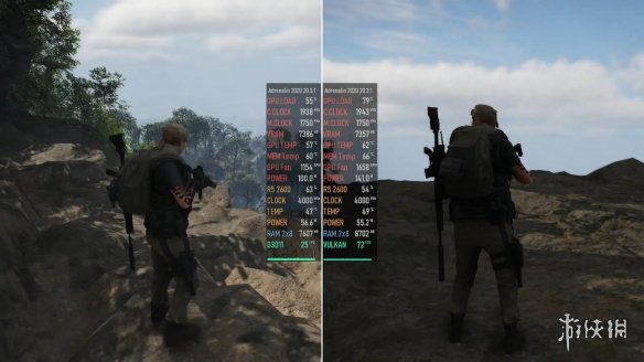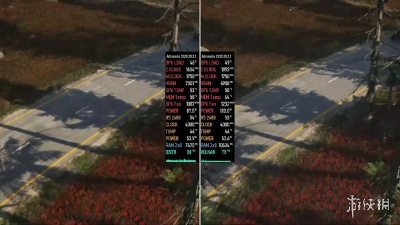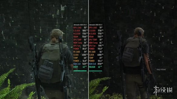 评测截图(左边是DX11,右边是Vulkan,最下面的数字为帧数):