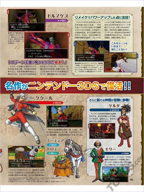 本期的Fami通给我们带来了3DS版《勇者斗恶龙8》的最新消息,同时官方也放出了大量的实机截图。本作将于2015年8月27日发售,售价为6458日元(含税)。