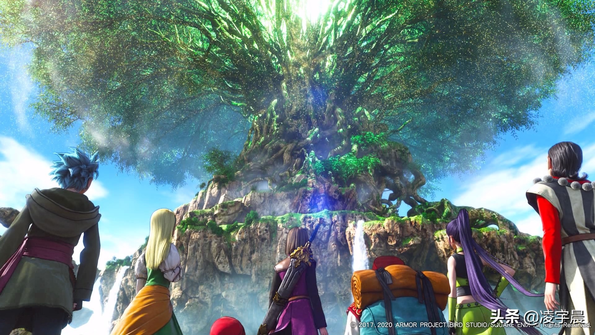 在题材选取上,《勇者斗恶龙》系列一直非常遵循传统,虽然每一作的主角背景经历不一,但最终都毫无例外的成为勇者踏上了拯救世界的道路。在DQ11中当然也不例外,主人公拥有大部分勇者故事的标准开局——首先是出身高贵,虽然这并非是必要的先决条件,但通常地位越高责任越大、也越有机会快人一步成为勇者(?),而我们的主人公身为王子自然是很够格的,更不要说自降生之日就拥有世界树指定的勇者标记,可谓是真正的天选之人;