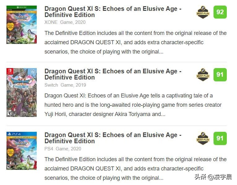作为JRPG类型的集大成者,DQ11并不仅仅只是年度RPG游戏的有力竞争者,即使将范围扩大到整个RPG游戏史上,它都如明珠一般耀眼,足以与玩家心目中那些具有崇高地位的经典作品相提并论。而S版则更上层楼,将这部杰作的最佳体验以几乎完美无缺的方式呈现在了玩家面前,事实上除了PC版没有单独的评分外,《勇者斗恶龙XI S 寻觅逝去的时光 - Definitive Edition》的所有主机平台版本在metacritic上都有超过90分的媒体均分。毫不夸张地说,这就是那种您错过后绝对要留下遗憾的作品,只要您对JRPG抱有兴趣那么就完全不需要在“买不买”这种小问题上纠结,最多是斟酌一下到底是原价购入立马开玩还是先不急等打折再购入让钱包君的负担稍小一些。
