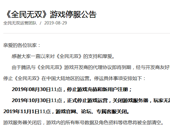 第二款:腾讯首款3D双操作动作手游《全民无双》将于2019年10月30日11点正式停服