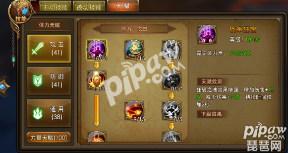 天赋的力量加点就是防御点出不死还有生存意志这样可以提升反杀能力,攻击就是点出斩杀效果而已,有几率可以斩杀哦,通用就是点右边的,别问为什么这个大家都知道,通用的38点,体力天赋就点出双盾,非常强的天赋,防御就点出右边的,通用的也是点出右边的天赋。