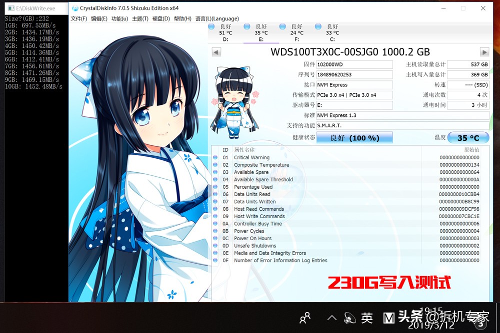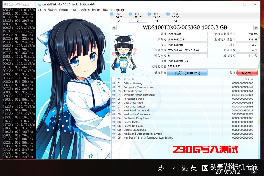 用PUFER自己编写的程序进行压力测试,设置连续写入230G看温度情况,同时230G这个容量基本上没有SSD可以逃出它的火眼金睛,必定是将缓存空间压榨完后的真实速度,