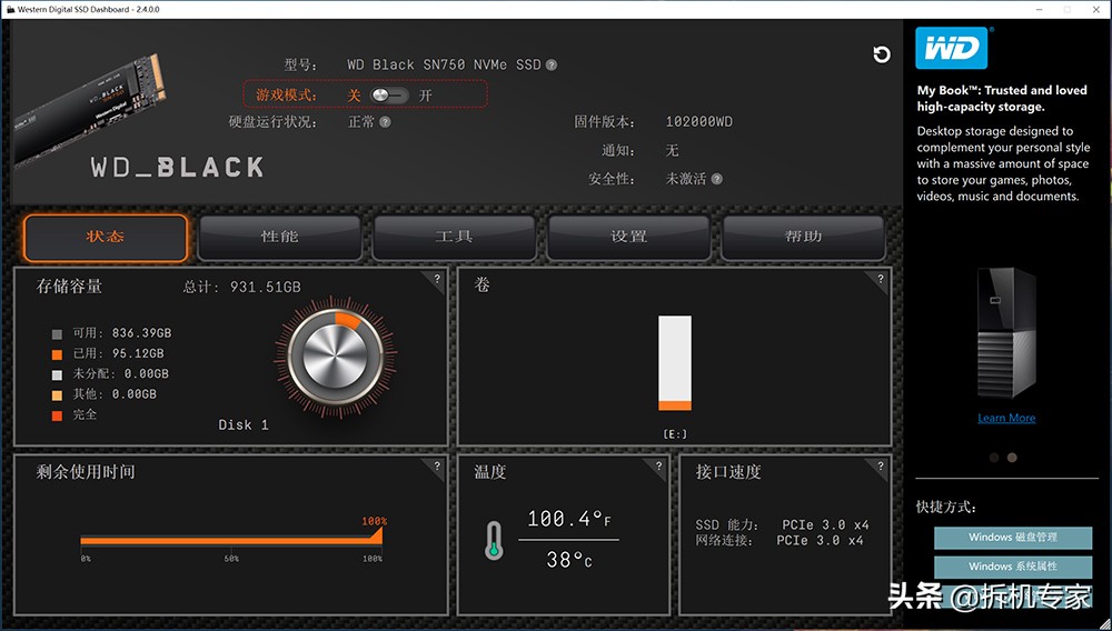 这回选择WD_Black SN750 NVMe SSD主要是考虑其性价比。考虑到以前容量总是不够用,所以这回一猛心直接上1T。西部数据在品质上还是很有优势的,而且据说还有配套的软件可以使用,我还有什么理由不选他呢?