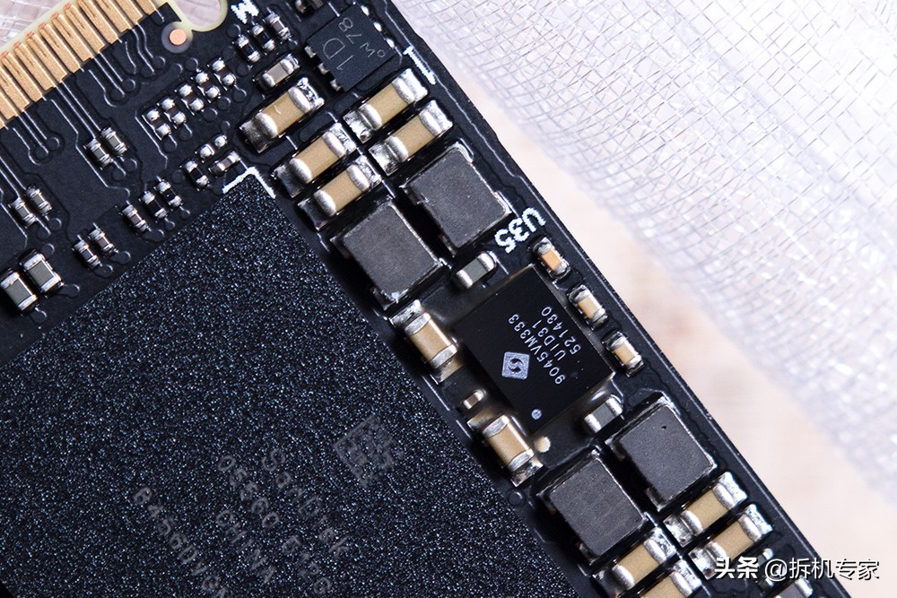 在NAND芯片边上是一片9045VM333供电管理IC,防掉压设计。拆机多年的老拆我看不明白的是:手机上用滴胶工艺是为了防尘防水,而这个SSD上的供电IC附近也采用了滴胶工艺,莫非SSD也有防尘要求?反正有总是好的。