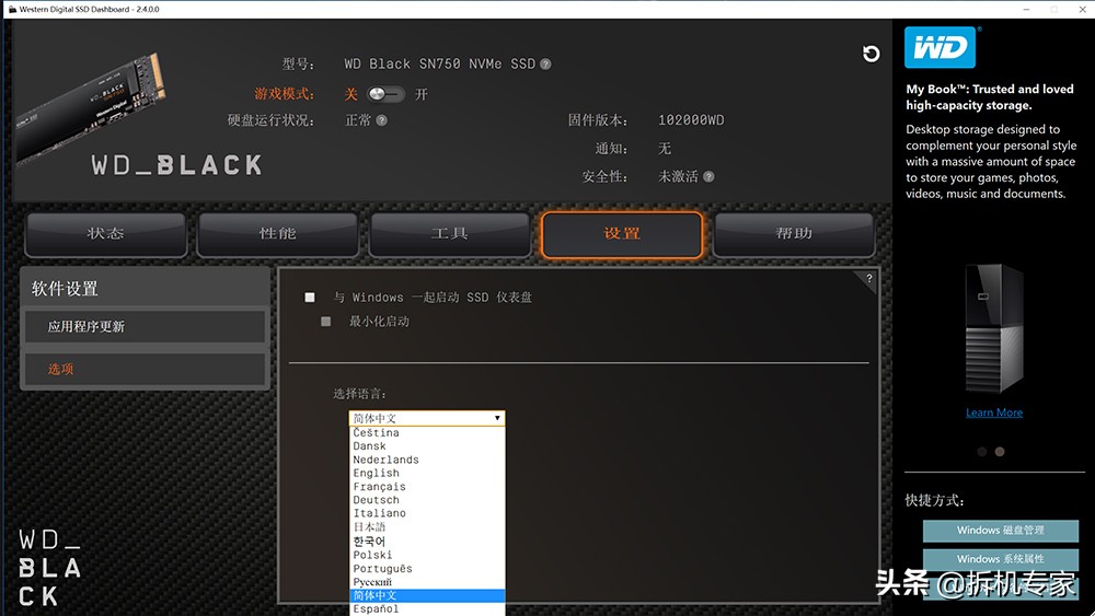 在进入游戏之前从官网下载安装了Western Digital SSD 仪表板工具用来打开游戏模式让性能进一步提升。