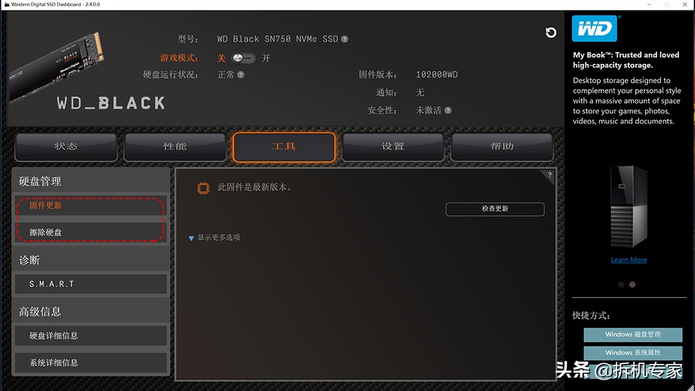 除了游戏模式最有用的就是工具里的这2个工具了,可以自动更新固件让SN750最大化实现性能同时擦除硬盘可以在工具中实现,再也不需要用U盘刷系统及大地方便了日后硬盘的修复。