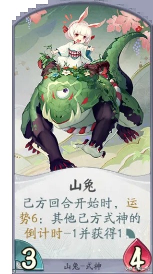 山兔是最为特殊的式神,是百闻牌的“欧皇”检测系统。使用某些卡牌会触发投骰子效果,只有骰子投出大于等于6时会有附加增益。有时甚至会让你直接获得游戏胜利(不过极难触发)。在使用三级形态牌后摇骰子的效果就变得可控。