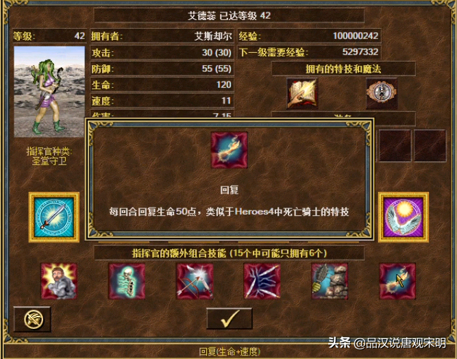 这个技能的效果到了最高级,可以让指挥官拥有30点力量,6次施法和95%的抗魔属性。