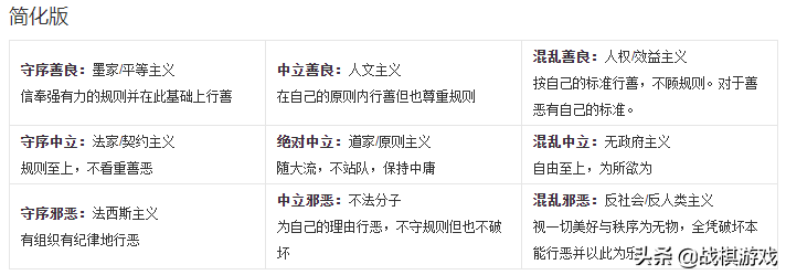这个表里,元素是绝对中立,但这个时候还没加进来。8个种族分别对应这里的8个阵营。具体就不说了(与本文主题无关啊,不能喧宾夺主)。大概知道3个善良3个邪恶2个中立就行了。