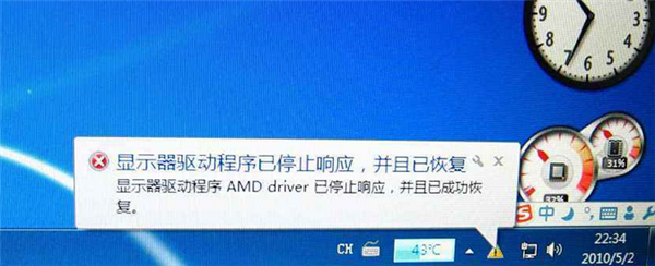 如果你是显卡超频玩家,应该会对下面这张图非常熟悉。在系统右下角会出现“显示器驱动程序停止响应,并且已成功恢复”的字样,这就是典型的显卡驱动崩溃后又重新恢复的现象。