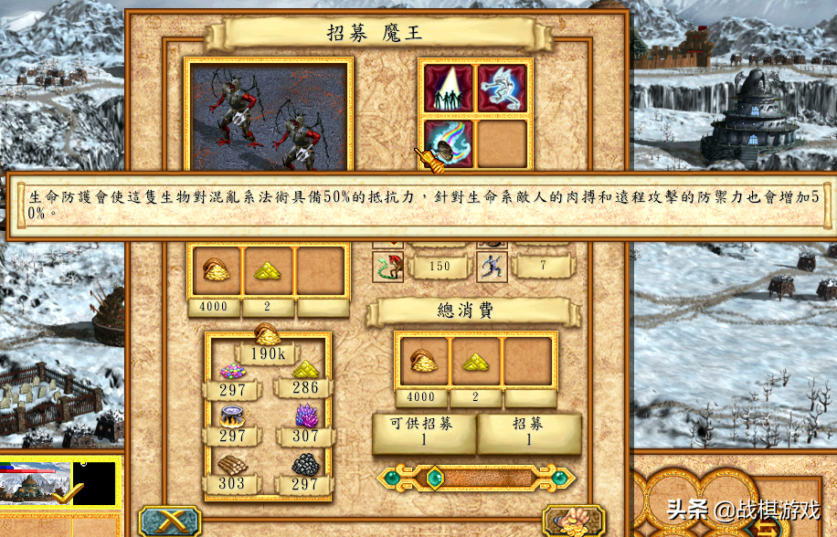 4级兵魔王:属性比骨龙差太多了。特技:传送。比飞行更强。飞行部队在攻城的时候,想进入城堡内部,必须先飞到城墙边,下一回合才能飞进去,而且只能先飞进去一格。而传送的移动方式不受任何限制。特技:召唤冰魔。使恶魔能够在战斗中召唤冰魔,消耗8点魔法值,召唤的冰魔数量等于恶魔自身数量。死亡城堡的奇迹建筑可将召唤数量加50%。特技:生命防护。对生命法术具备50%的抵抗力,并且对生命系敌人肉搏和远程的防御力也增加50%。恶魔终于有资本和天使对决了。宗师自然魔法+宗师鬼神学(死亡魔法的子技能)=英雄自动学会在战斗中召唤恶魔。尴尬啊。。。。魔法修炼一个到宗师都相当的难,更别说2个了。。。。一个地图哪有那么多经验给你升级。就算真的费尽心力全搞到宗师,对面英雄战斗系+战术系双宗师,能虐到你怀疑人生。