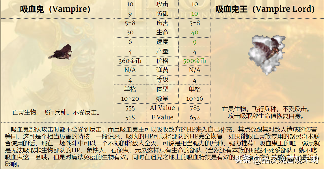 吸血鬼王的属性相对还可以,但是特技实在是IMBA,堪称是死亡凝视下的第二强兵种特技。