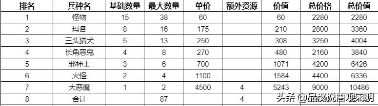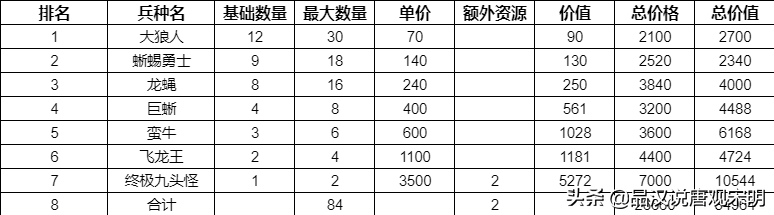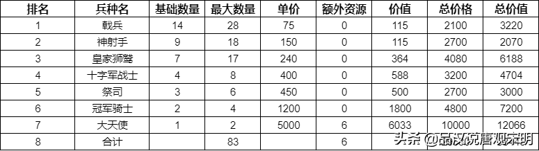 在这个维度,我们统计三个数据:七个等级兵的总周产量(参考)、总花费的价格与额外资源、以及兵种的总战斗价值。
