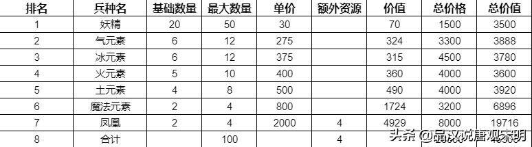 因为比其他种族多一倍的顶级兵数量,但是价格却依然和其他种族没啥区别。所以元素族的单周兵力总价值高达45300,其中凤凰就占据了将近一半即19716;要知道,其他种族里七级兵占比最高的黑龙,也不过是13566点价值。而这两个兵种的价格却是一模一样的。