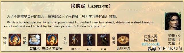 埃德妮:特长火系魔法,初始自带初级智慧术和高级火系魔法。唯一一个出生带有4个技能点的英雄,1级高火的伤害确实厉害。