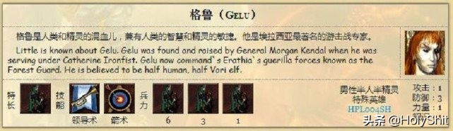 格鲁:特长幻影射手,初始自带初级领导术和初级箭术。他能将精灵射手和人族的弓箭兵升级为幻影射手,高攻高防高速,特别适合速攻。