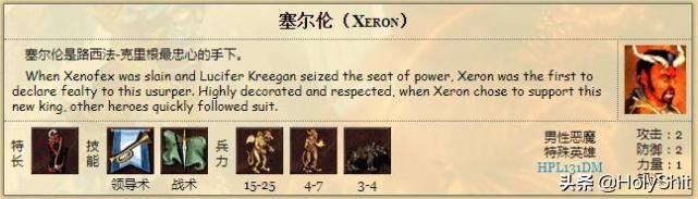 塞尔伦:特长恶魔,初始自带初级领导术和初级战术。虽然是七级兵种特,但只固定增加4点攻击,2点防御和1点速度,修正后的恶魔还是不很厉害,和隐藏英雄的身份不匹配。