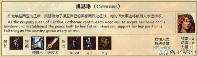 凯瑟琳:特长剑士,初始自带初级领导术和初级进攻术。不得不说这个隐藏英雄和常规英雄没啥区别,是埃拉西亚的光复战役的女主角。