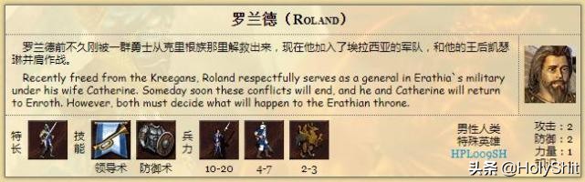 罗兰德:特长剑士,初始自带初级领导术和初级防御术。和凯瑟琳一样,披着隐藏外皮的常规英雄,是凯瑟琳的老公。