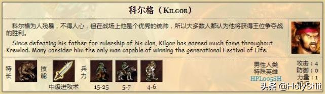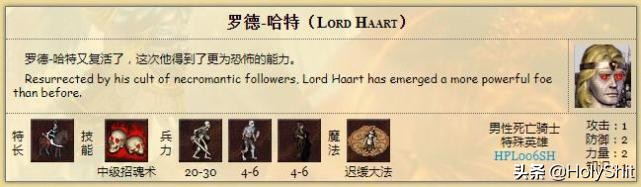 罗德-哈特:特长死亡骑士,初始自带中级招魂术。罗德哈特本来是人族的骑士,特长是理财术,死后被亡灵巫师复活后掌握了死亡骑士的奥秘,从而转为死亡骑士特长的英雄,他能给死亡骑士加攻击防御各5点,伤害加10点,虽然也是固定加成,很明显比楼上的实用。