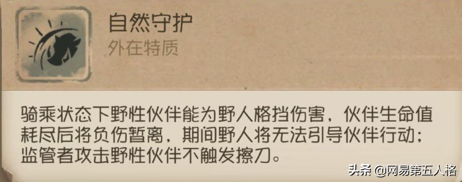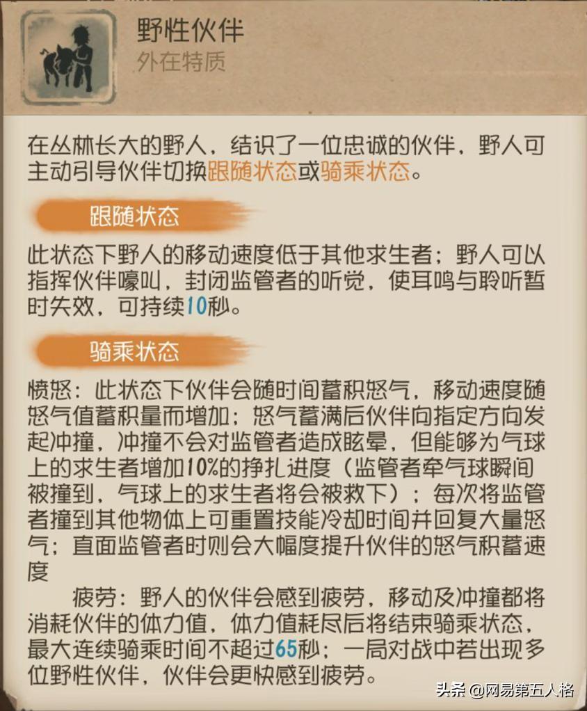 ① 当监管者寻找求生者时,跟随状态下的野人可以指挥野性伙伴嚎叫,封闭监管者的听觉,使【耳鸣】与【聆听】在一段时间内失效,导致监管者难以根据【耳鸣】或【聆听】发现求生者的位置;