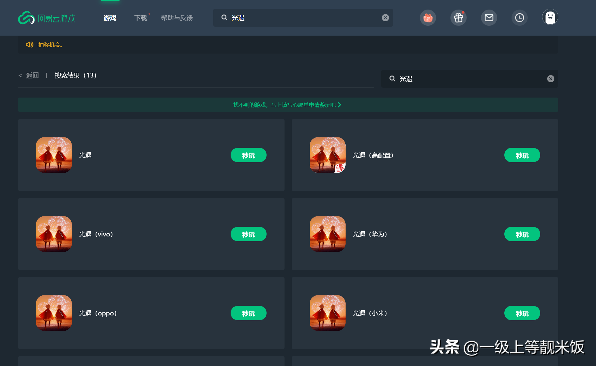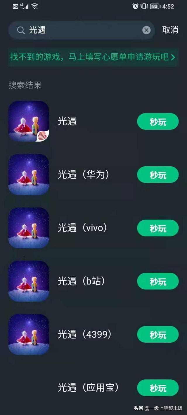2.找到《光遇》并点击“秒玩”。