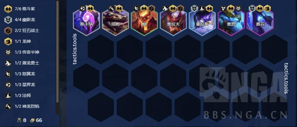 2阶段:格斗家过渡的好处就是过渡很平滑,无论是塔姆(蛤蟆)还是斯卡纳(蝎子)都是很好的打工卡。留换形师及射手牌,进行摇摆过渡。