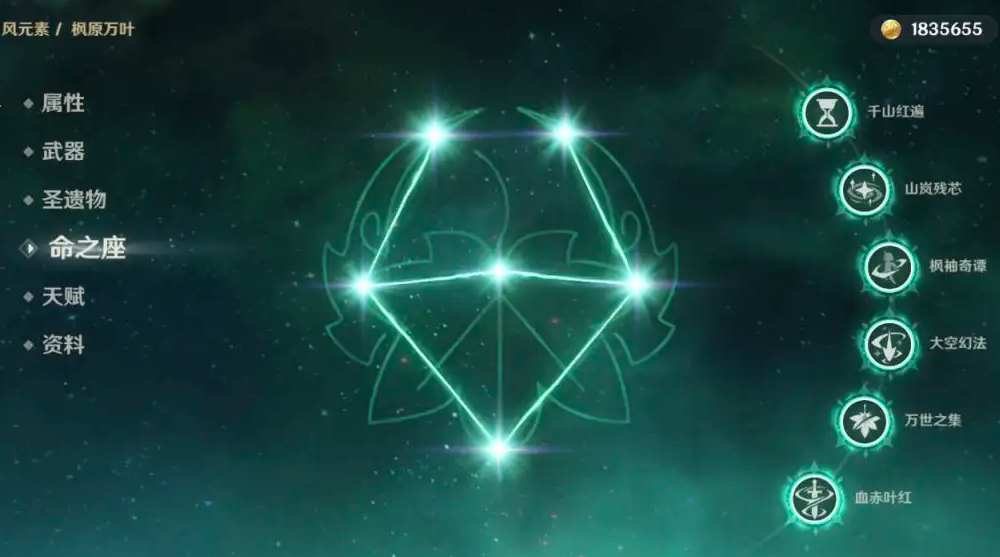 命之座6:【血赤叶红】释放E或者Q后根据元素精通增加万叶的伤害并且附魔风属性,1000精通可以提高万叶200%的伤害。