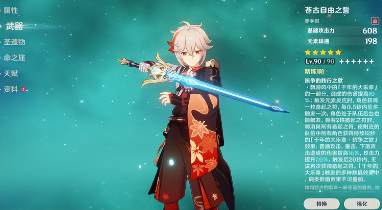 苍古自由之誓90级属性:主属性608攻击,副属性198元素精通。作为一把精通副属性武器,现版本只有万叶比较适合,触发武器特效后,效果非常强,在高精条件下的特效数值也是很惊人的,但是对于平民玩家来说,1精专武的20%攻击力提升,在众多攻击力乘区和增伤乘区的稀释下,对大部分主C额外提升不会超过15%,表现只能说尚可,所以对平民玩家来讲不太建议抽,建议氪金玩家精5。