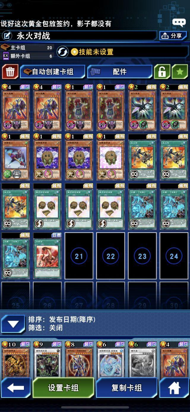 目前没刷到技能所以没有测试,带两张甲虫和恶魔是害怕被除外,不过因为没有测试还在脑补阶段,剩下的基本就是保护自己的组件了。(这卡组国际服也没玩过,不会倒遇见过几次)永火没什么好说的,虽然展开慢需要第2个自己回合启动,不过好在带的保命牌多,起手也一般只需求幻想或者炮,也算是有点可玩性和能玩性的同调卡组了。