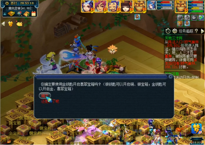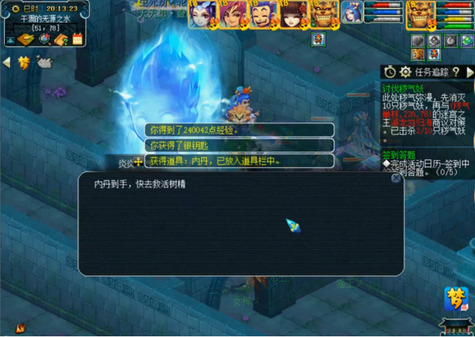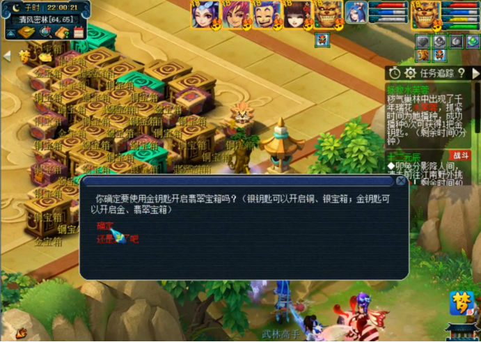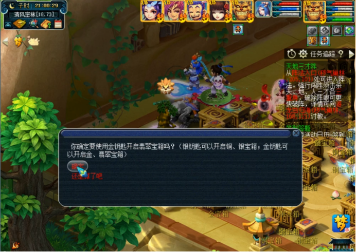 后两个有几率得金钥匙,这很重要,因为刚才杀的内丹需要配合金钥匙才能发挥最佳效果,有了内丹可以随时潜入地下开箱子,众所周知,箱子里奖励最好的是翡翠宝箱,不过这玩意儿须得金钥匙方能打开。这个开箱的机会首次出现在8点40分左右,带着金钥匙去找树精,把内丹给它