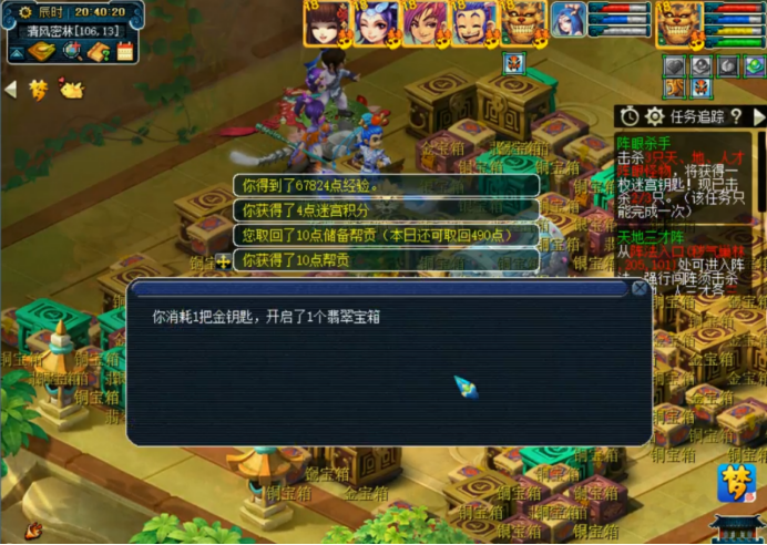 8点50分,藏宝地开放第一轮,全体帮众哄抢第一波箱子。建议按翡翠、银、金、铜的顺序开箱子,这个排序是根据性价比决定的。这轮咱们留点金钥匙等下开内丹用。