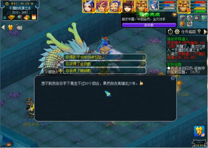 有实力的小伙伴可以考虑进去挑战一下银龙,成功后必给1金1银两把钥匙,难度的话感觉就是一般的侠士难度吧。金龙就不建议搞了,要防守十个回合,太墨迹了,有那时间不如多刷几个外星人。当然,有的帮派这两条龙是被帮主承包了的,那就只能作罢。还有,杀蛇死亡是没有损失的,大家放心大胆去杀。下面我们就实战演练一下上古化蛇是怎么杀的。