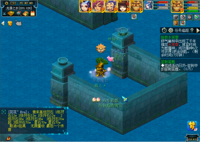 没抢到箱子的话就返回去看看有没有机会做水芙蓉的任务,做满6只会得1把金钥匙,散队做,一人点一只芙蓉,记住各自的坐标,然后再组队下去播种杀怪。这些都做完了基本就没啥事了,就等10点开最后一波箱子了。