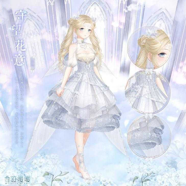 守望花意这个套装的设计虽然比不上澄净之羽来得这么精致,但质量还是过关的,小礼裙加上双马尾的设计还是很讨好玩家的审美水平的,简约却又不失设计感,而且当时奇暖官方还新增了一个“心愿套装”的设定,这让玩家对这套的喜爱程度直接UP,有时候策划会直接影响大家对套装的喜爱程度。