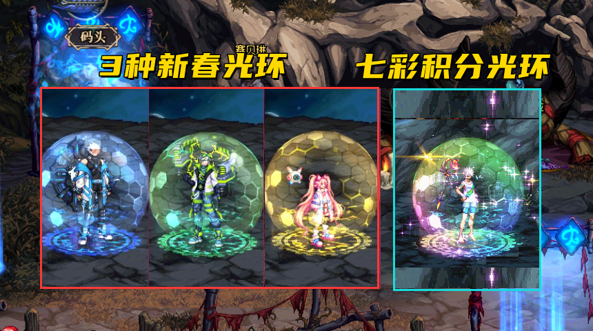 2、“光环系列”,本次新春档总共有4个光环出现,其中3个来源于新春光环礼盒,外观上分为蓝色、绿色、橙色,颜值还算不错,不过属性很一般,只能作为过渡使用,没有金秋光环的玩家可以考虑。