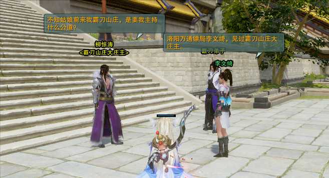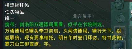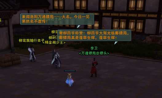 不多时霸刀山庄柳四爷来访,剧情结束后来到院子里对话李卫。李卫称此次押镖事关重大,须得倾尽镖局的人手护送,遂将镖局交给女儿李文绮打理。