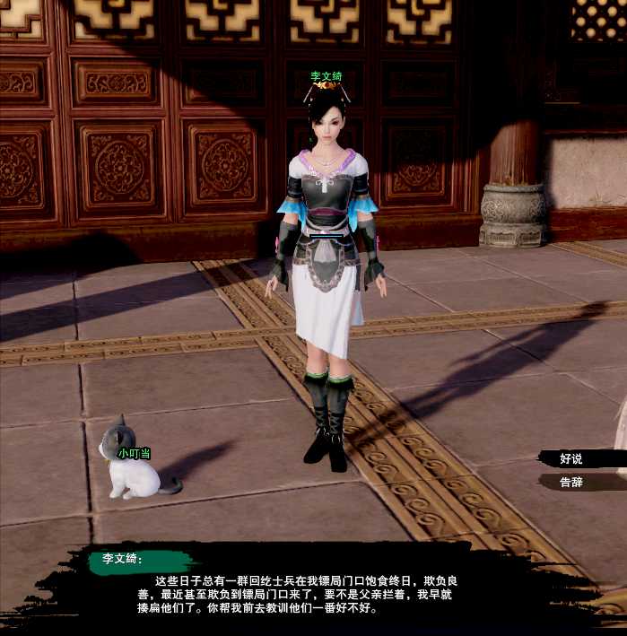 触发奇遇后,来到洛阳城地图左下角位置,对话NPC李卫,见到李卫的女儿李文绮和她养的猫小叮当。