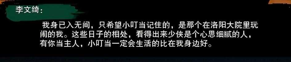 离开霸刀山庄,李文绮将小叮当托付给玩家,她要为父亲和镖局的伙计们报仇,以后漂泊江湖,不忍心小叮当跟着自己吃苦。