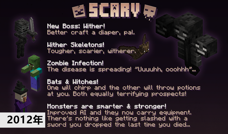 Minecraft发布了“1.4.2骇人更新”,加入了头颅、女巫、僵尸村民、一个新的Boss凋灵、命令方块、信标等等。这也是首次《我的世界》在版本更新中加入了“版本主题”的设定。有趣的是1.4.0和1.4.1并没有发布,而是直接跳到了1.4.2。