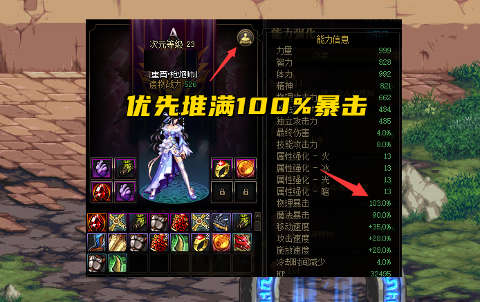 其中最重要的,就是先把“暴击”加到100%,然后再加三攻、速度和冷却。