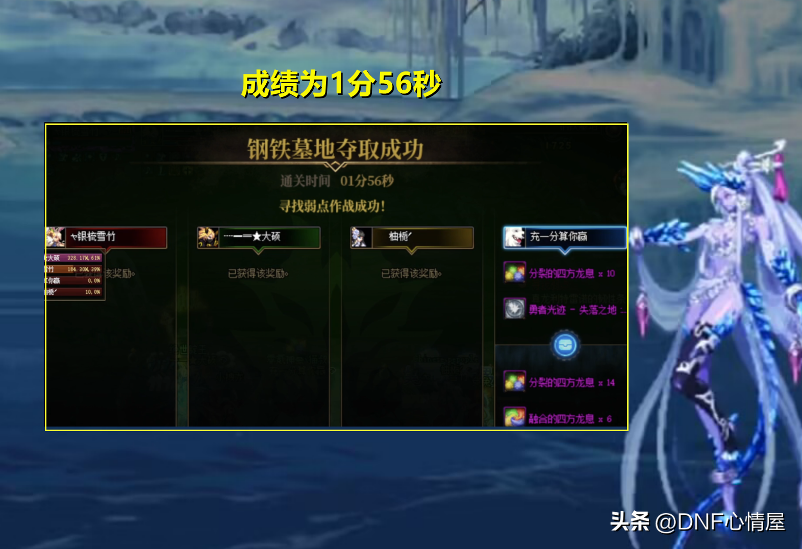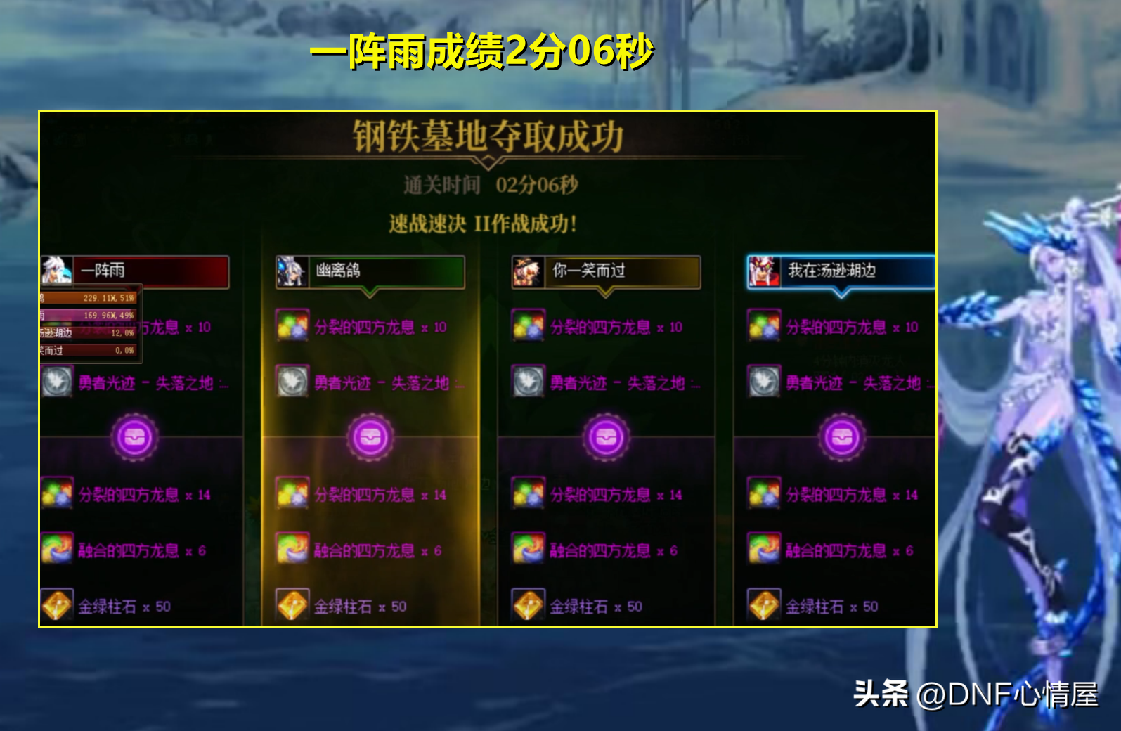 一阵雨武极+似雨幽离剑魂(操作者黑莲),打出了2分06秒的成绩,没有进入2分以内,虽说有些惋惜,但已经尽力了!一阵雨没等到武极加强,要不然成绩方面,还能够再提升。