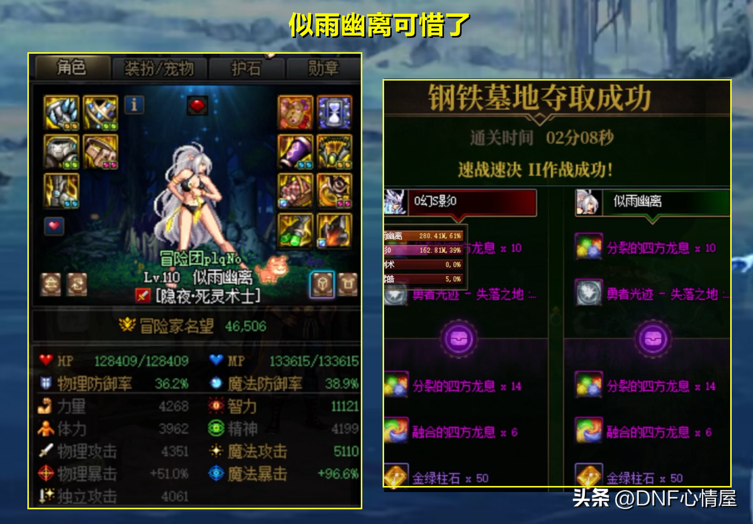 似雨幽离红20耳环死灵,表现的同样出色,跟搭档鬼泣“安夏”合作。可惜第一盘的时候,鬼泣出现失误,竟然破刃时被冰阵冰住了,否则能超越一阵雨。第二盘没第一盘打得好,打出了2分08秒,一阵雨开心坏了,幸好没有被超过!