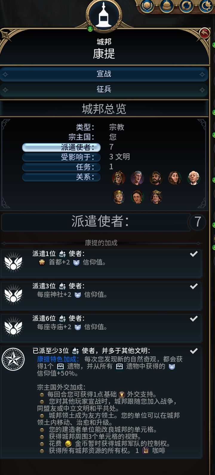 往城邦派遣一个使者后,即可享有首都加成,这个加成可以直接作用于首都。比如宗邦(宗教城邦)是首都每回合+2信仰,如果首发(首次发现,即成为第一个与该城邦接触的文明)宗邦可以很快的帮助我们攒够25信仰,尽早抢下万神殿。
