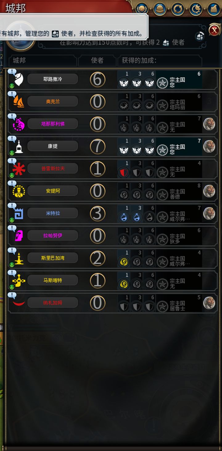 城邦对应区域,分为六大类型,宗教、军事、商业、科研、文化、工业,往城邦派遣使者可以享受加成,且加成一共分为3个阶段。