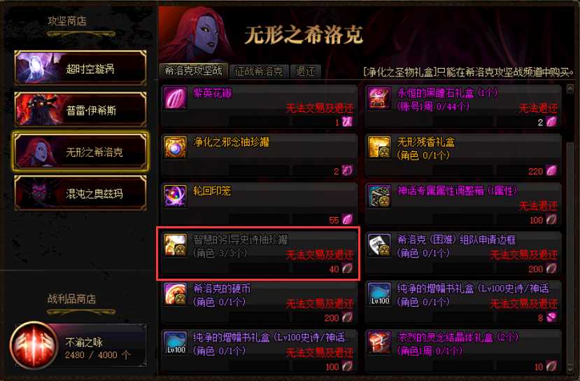 希洛克攻坚商店分为两部分,分别是希洛克攻坚战与希洛克征战模式,在前者商店当中勇士们可以使用40绚烂水晶花瓣兑换一个智慧的引导史诗袖珍罐,打开之后会随机获得一件史诗装备(工作服除外),每个角色可以兑换3个。