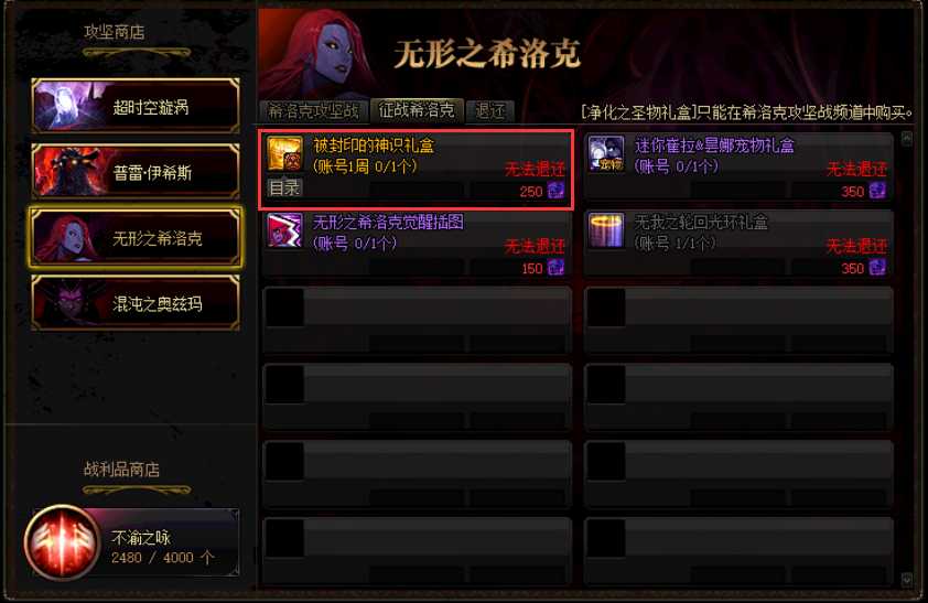 后者商店当中可以使用250个神识之种兑换一个被封印的神识礼盒,打开之后可以在防具与首饰/特殊装备礼盒当中选择获得一个,每个账号每周可以兑换一个。
